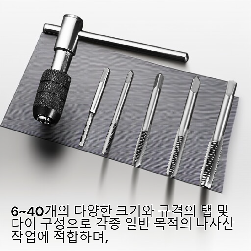 ● 6~40개의 다양한 크기와 규격의 탭 및 다이 구성으로 각종 일반 목적의 나사산 작업에 적합하며, 가정 및 산업 현장에서 모두 활용 가능합니다.
